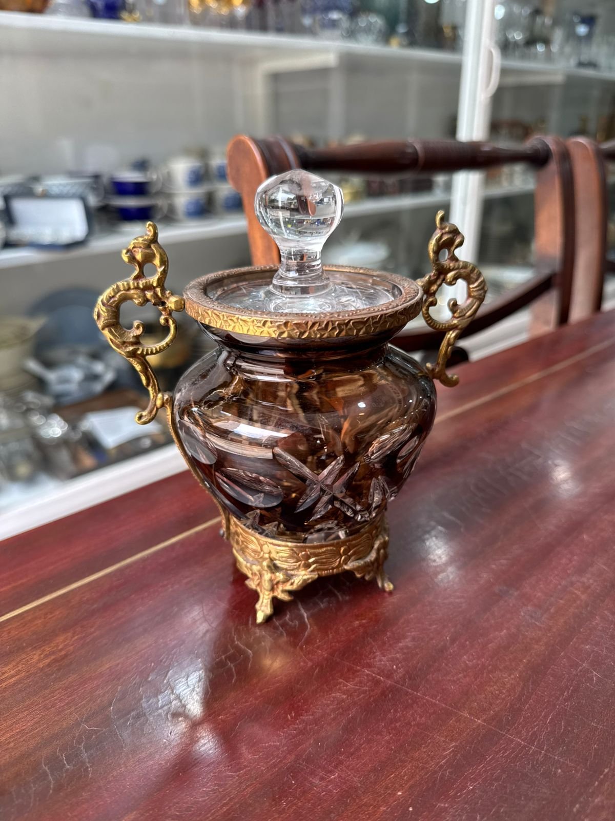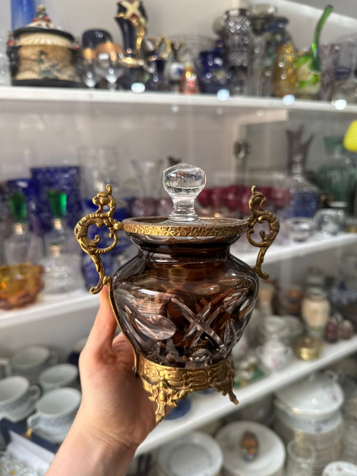Bombonera de cristal súper tallado marron con monturas de bronce