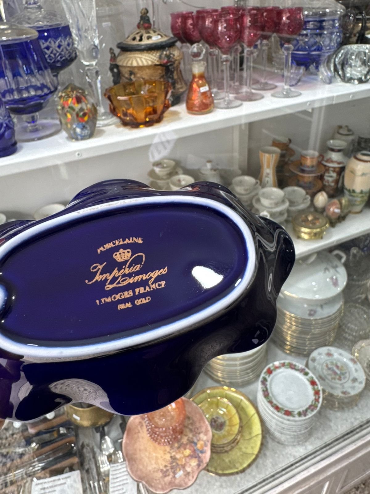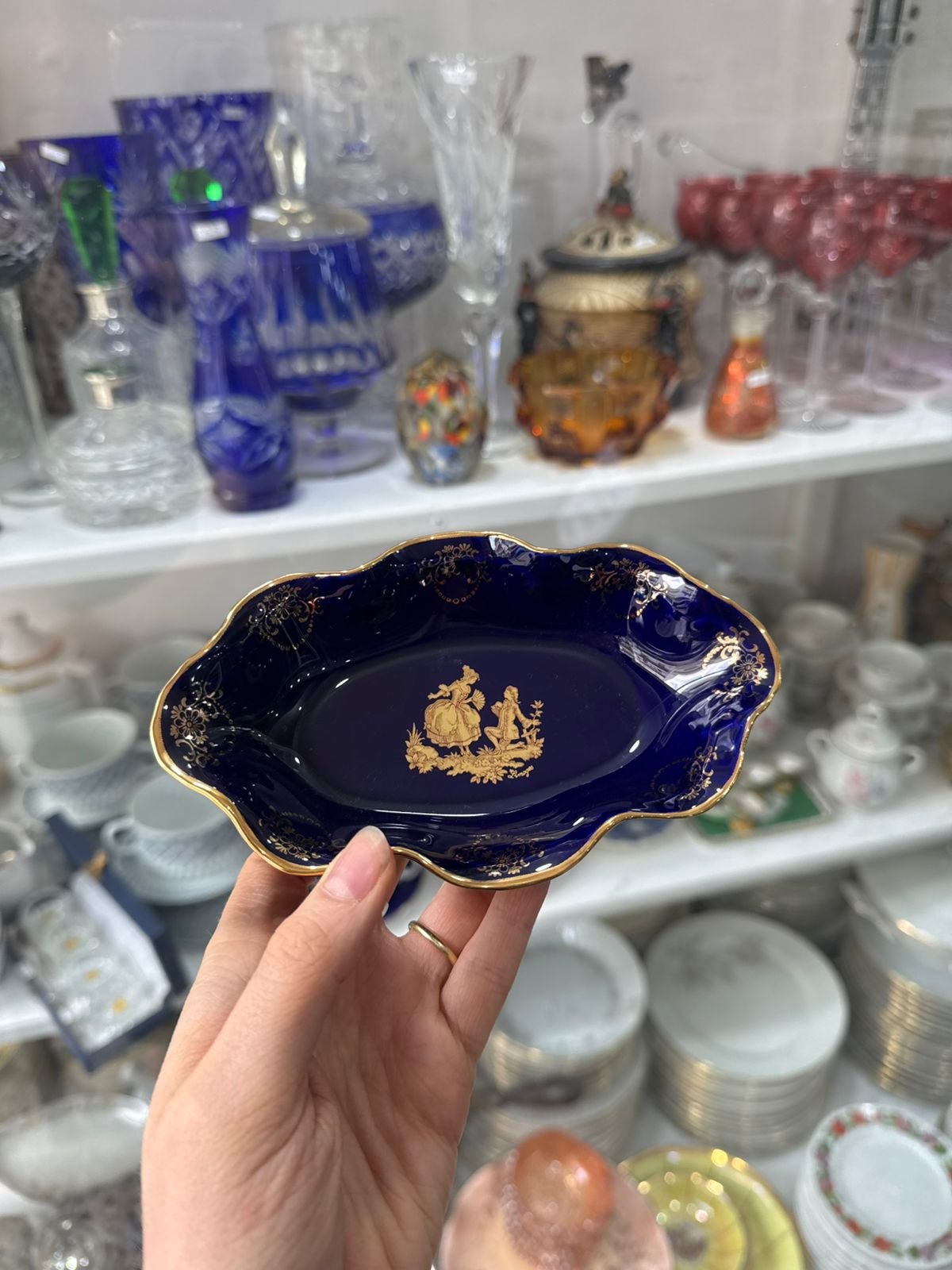 Despojador porcelana LIMOGES azul cobalto con oro con escena galante