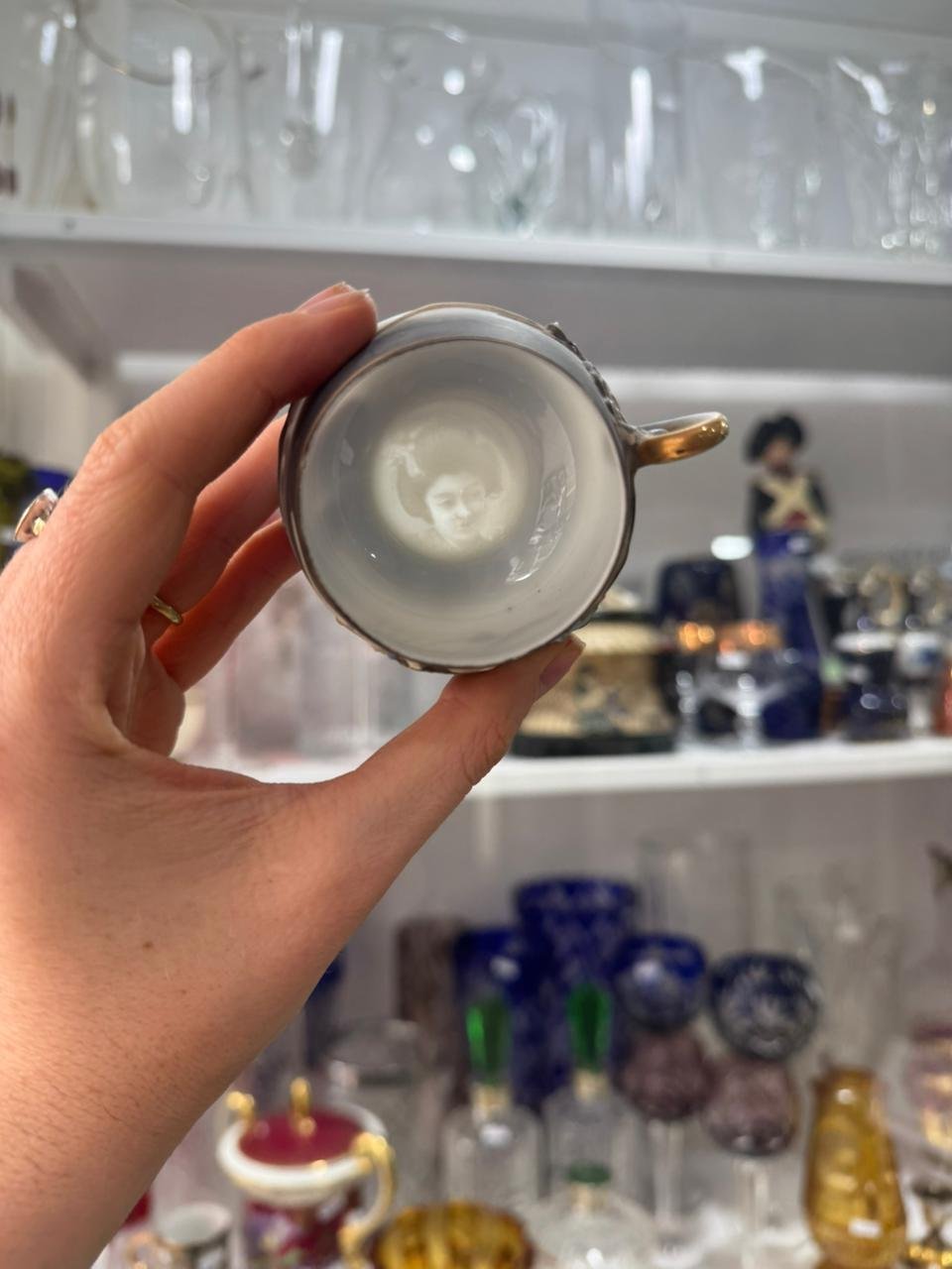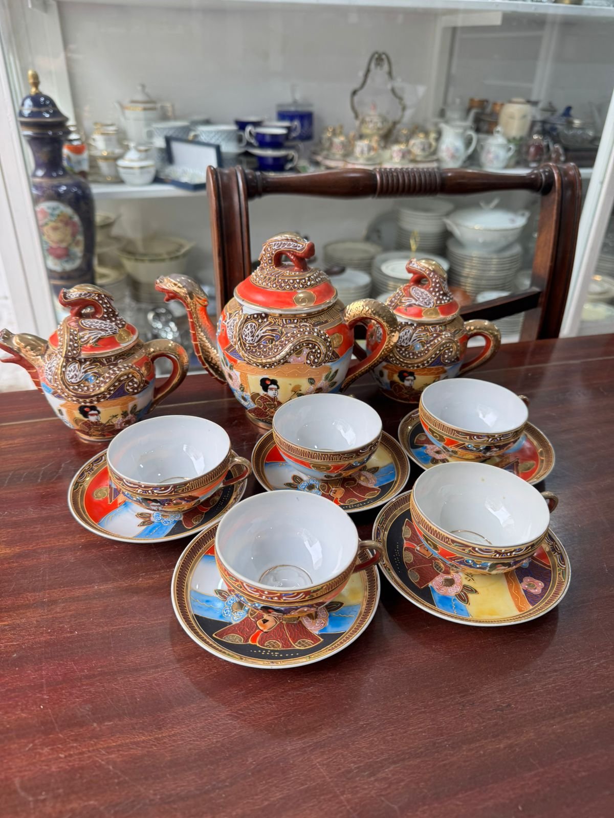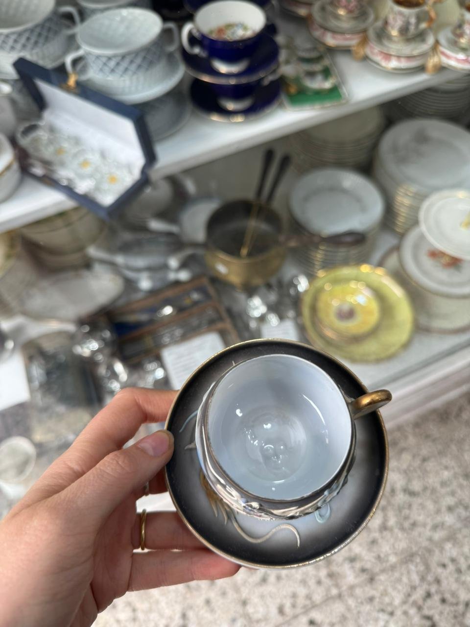 Dúo de café porcelana japonesa se ve la geisha en el fondo de la taza