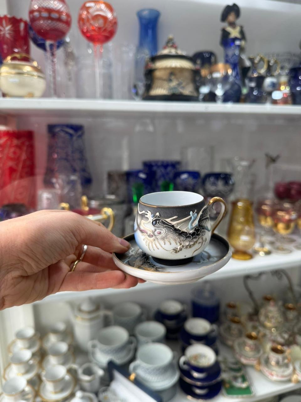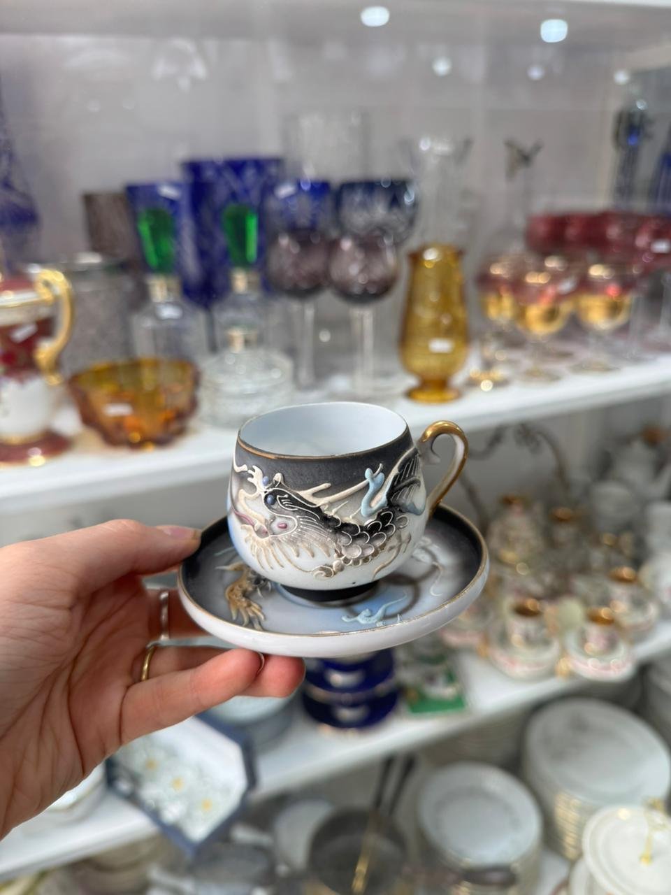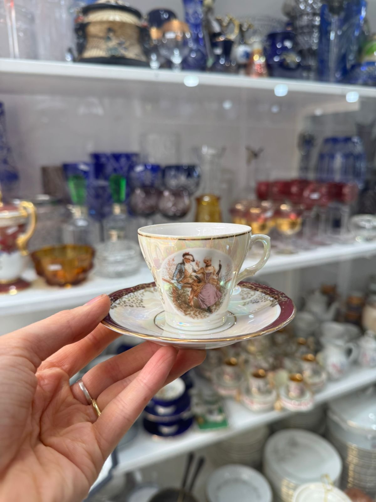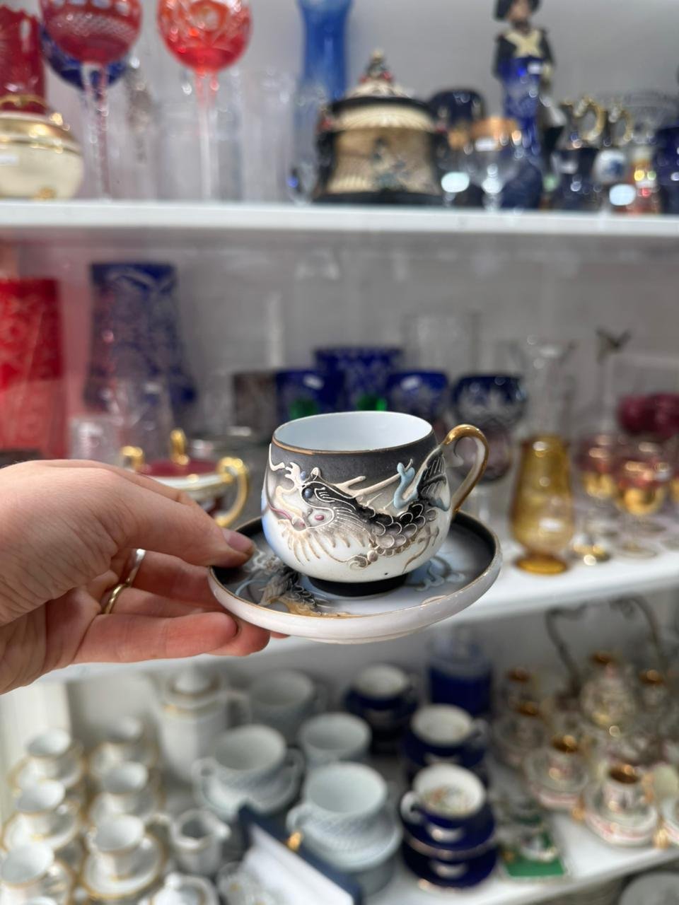 Dúo de café porcelana japonesa se ve la geisha en el fondo de la taza