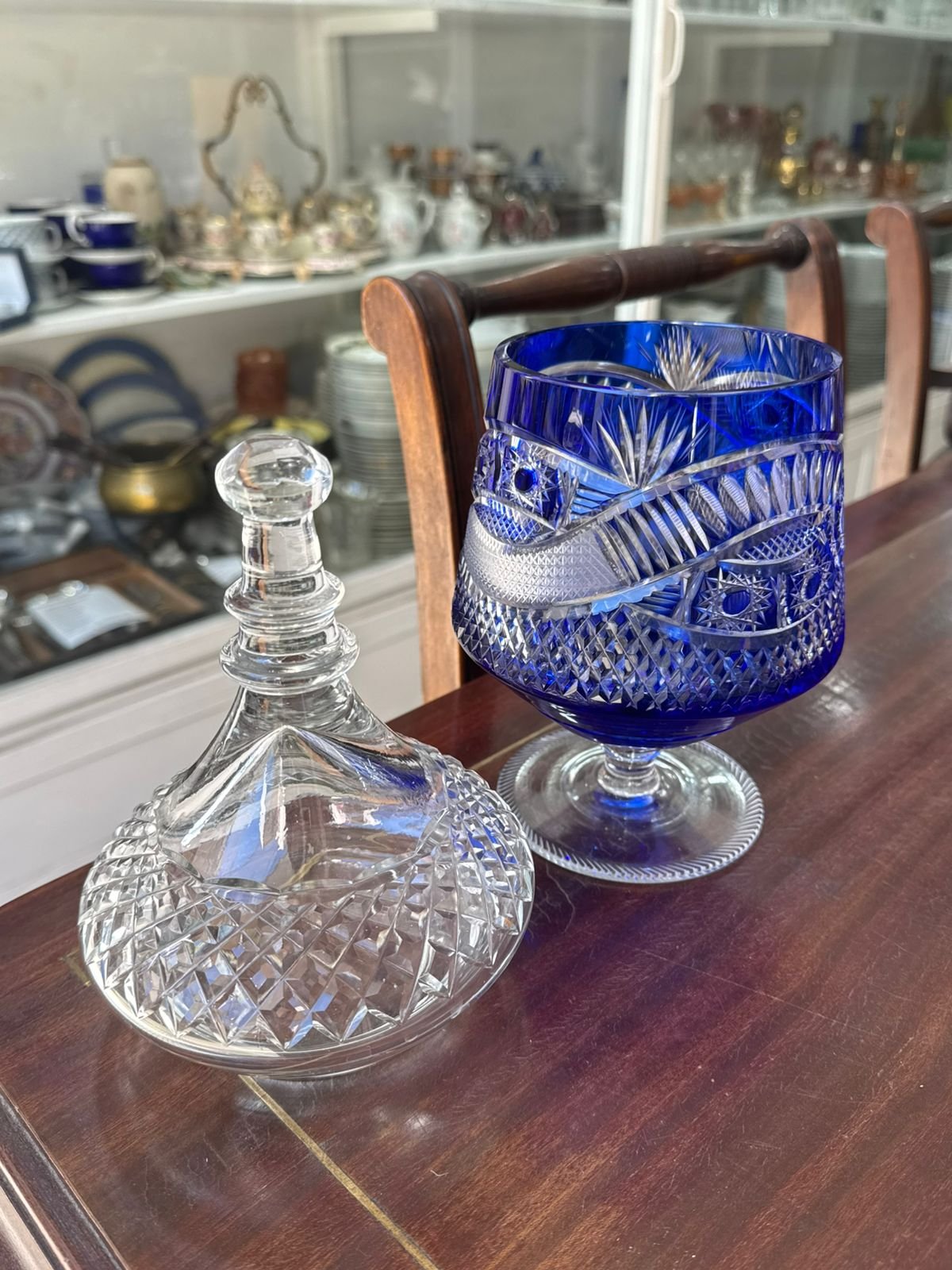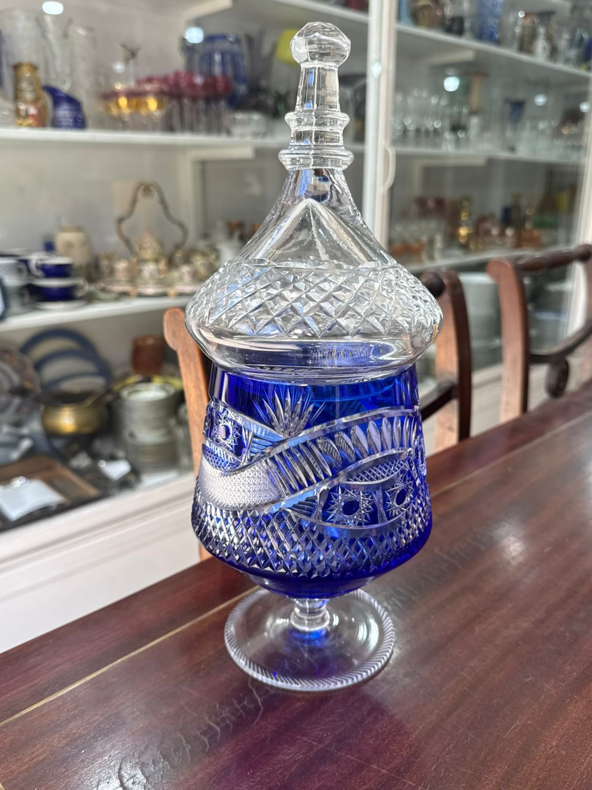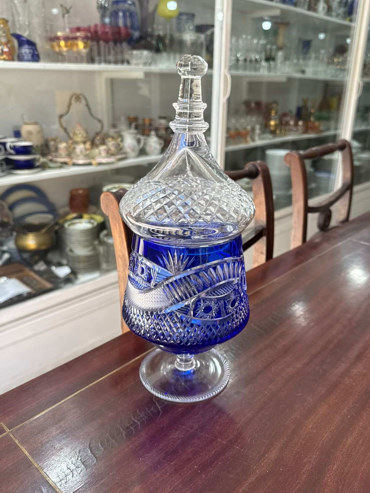 Exquisita caramelera o bombonera cristal súper tallado azul