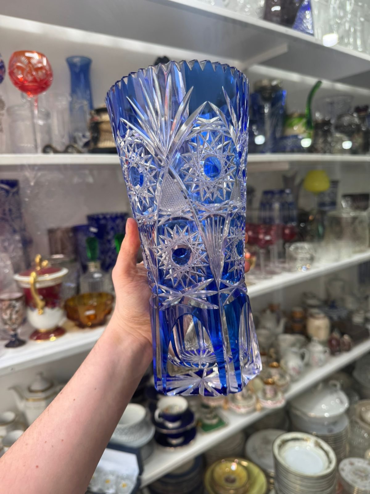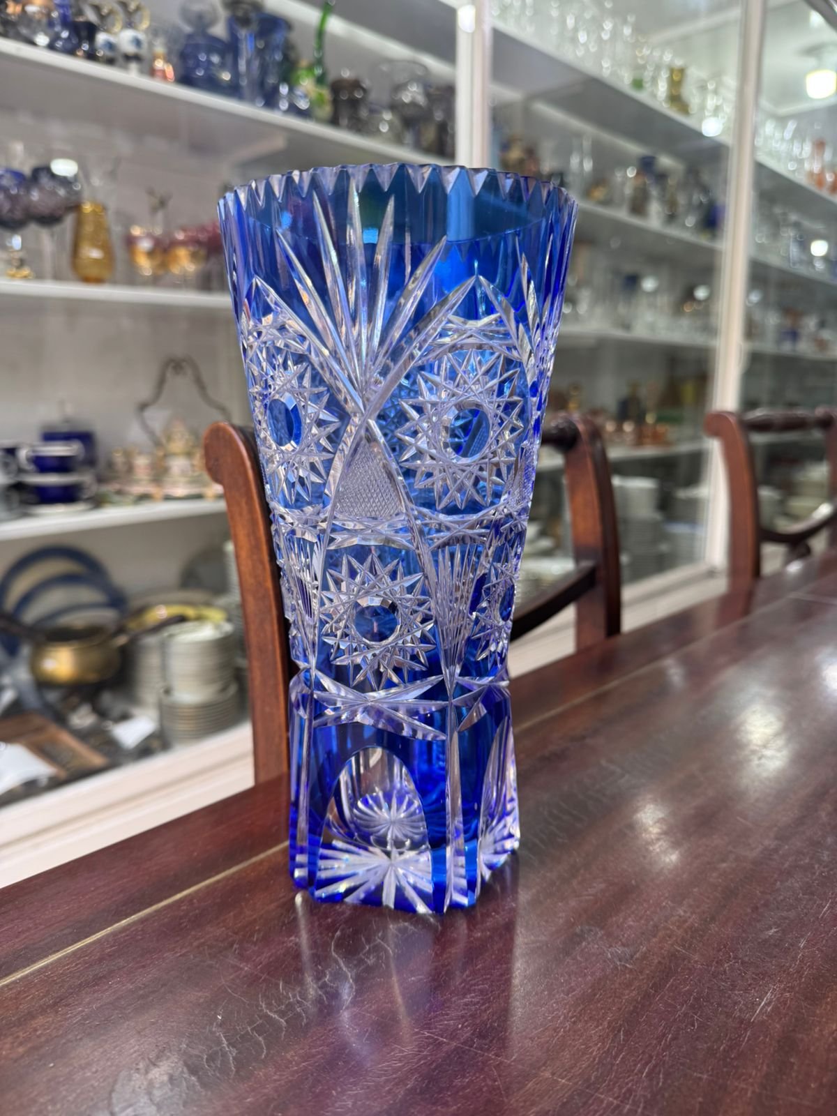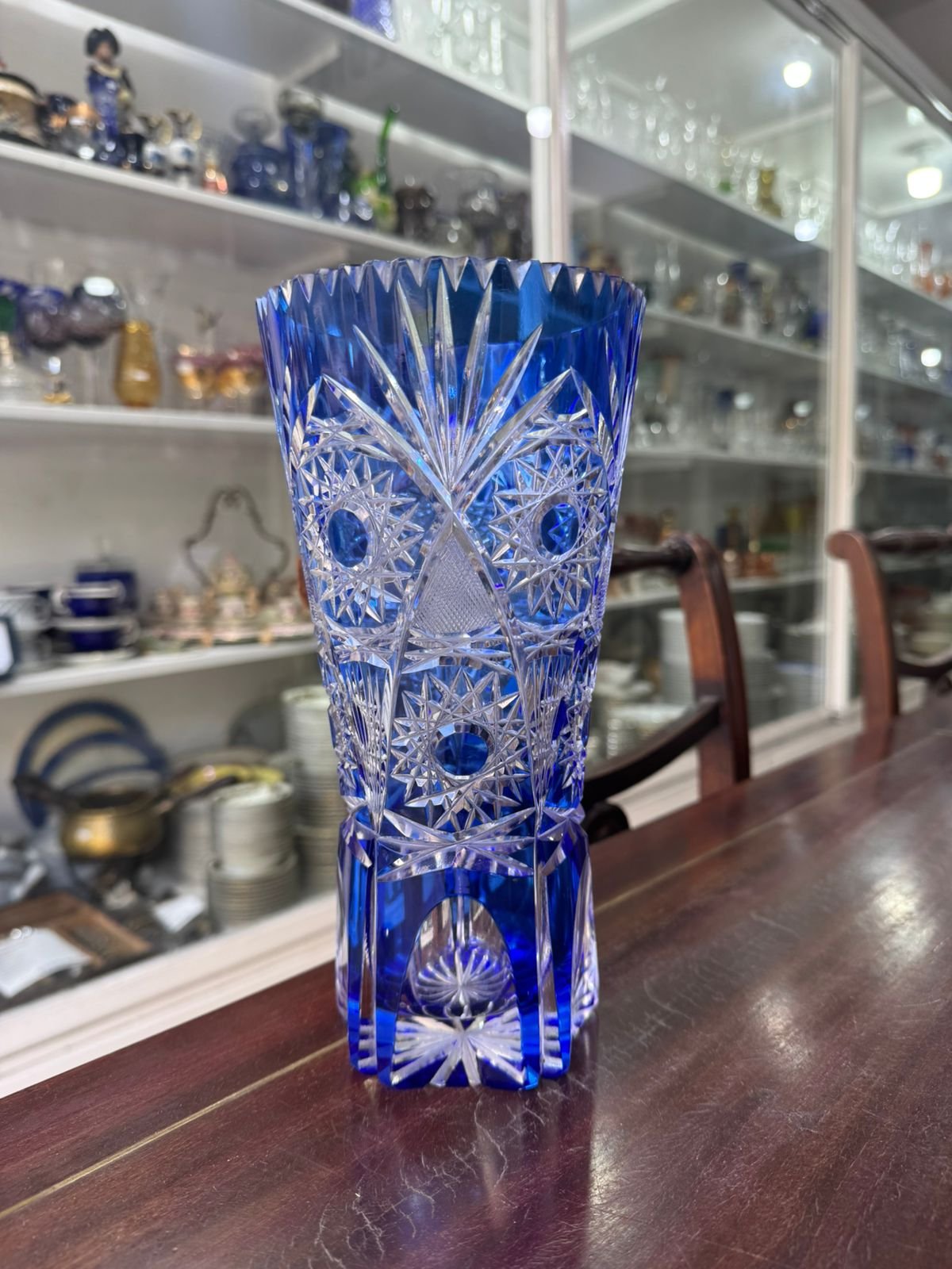 Exquisito florero de cristal súper tallado azul