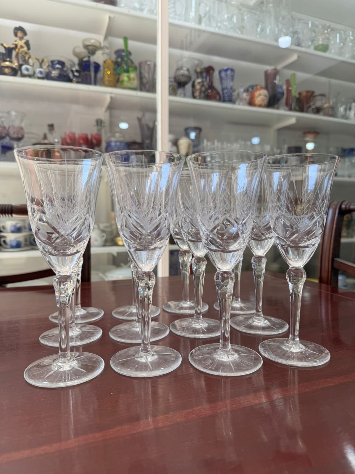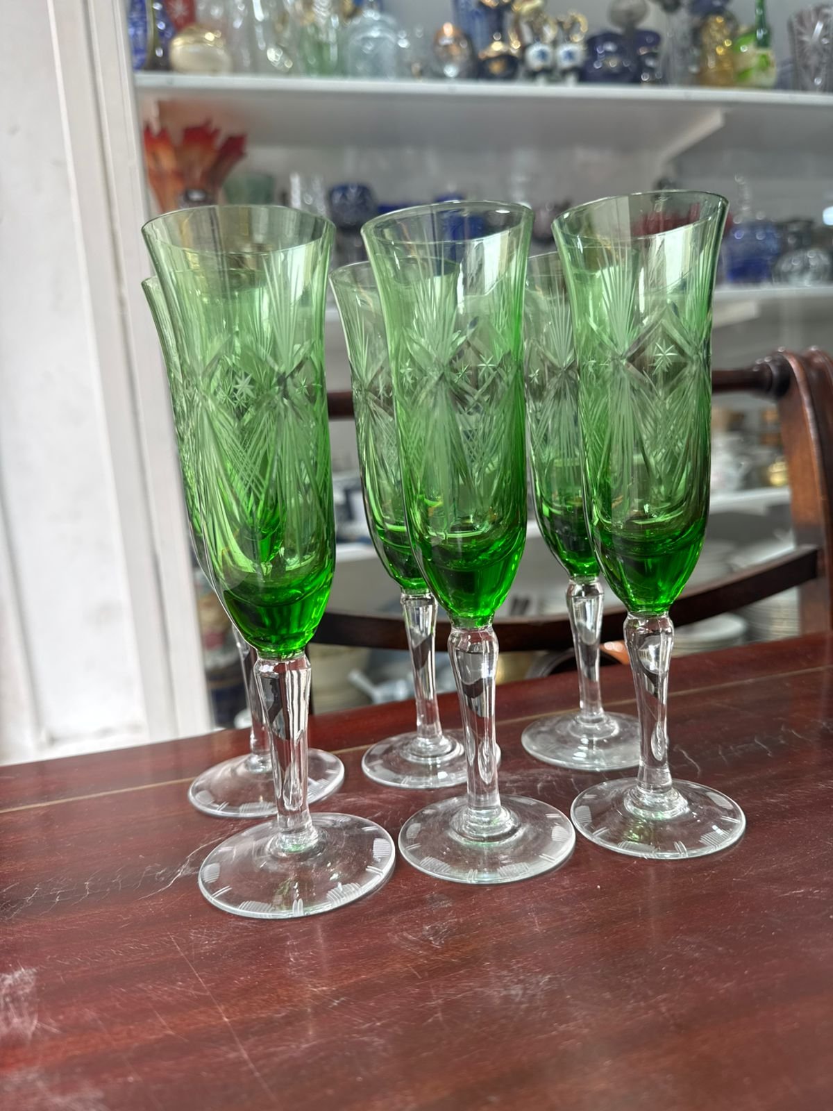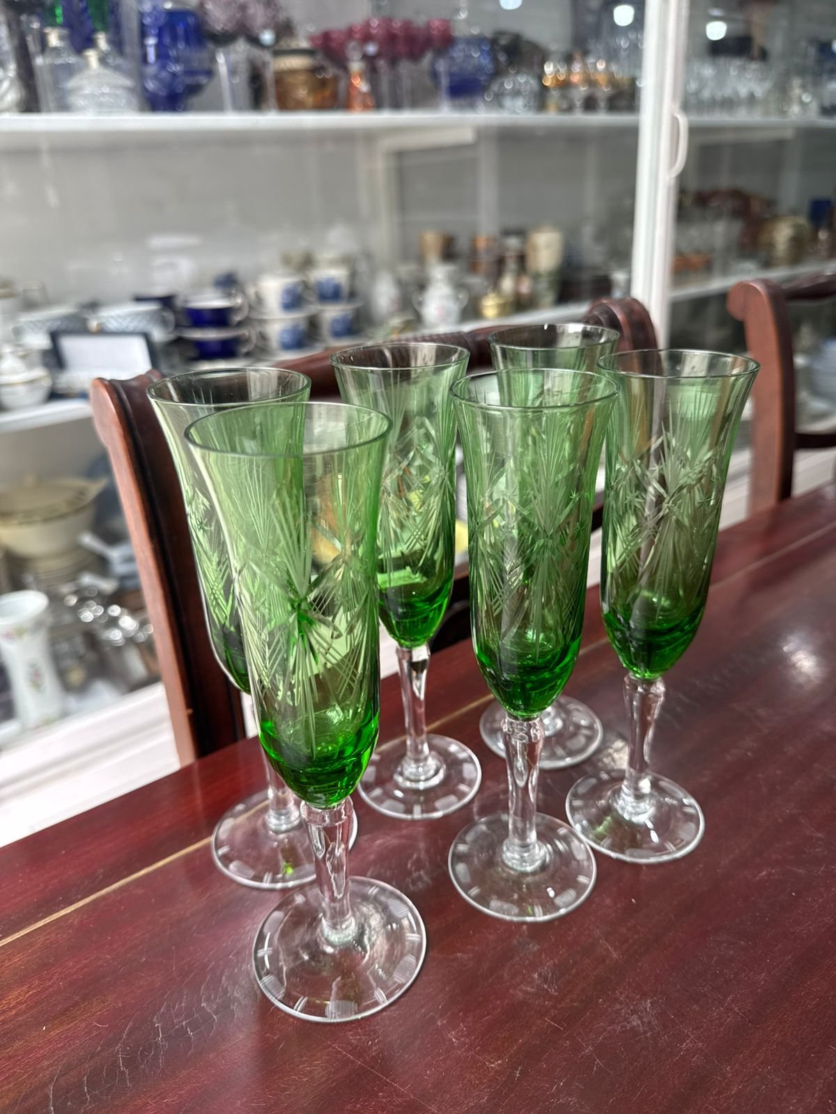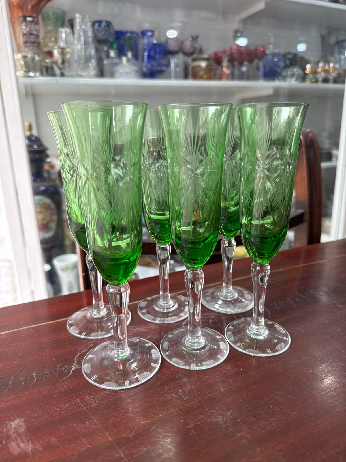 Juego de 6 copas de cristal súper tallado verde para champagne
