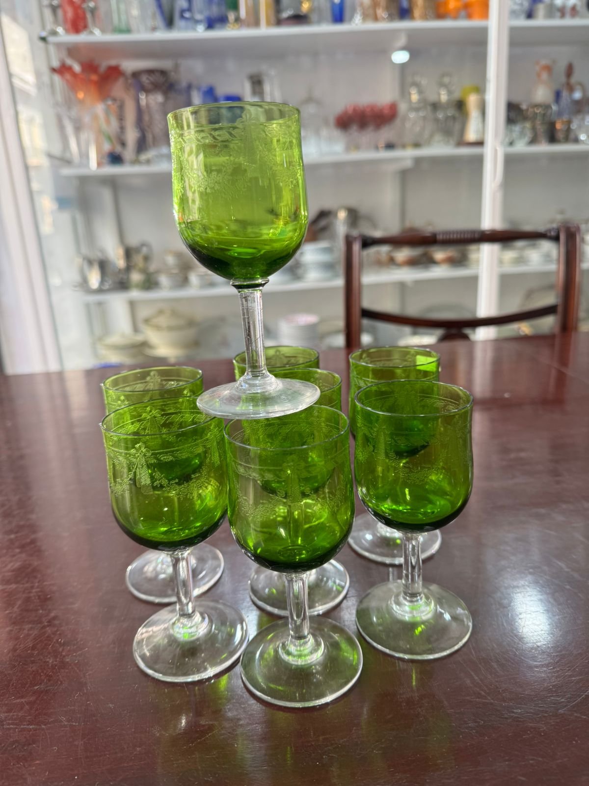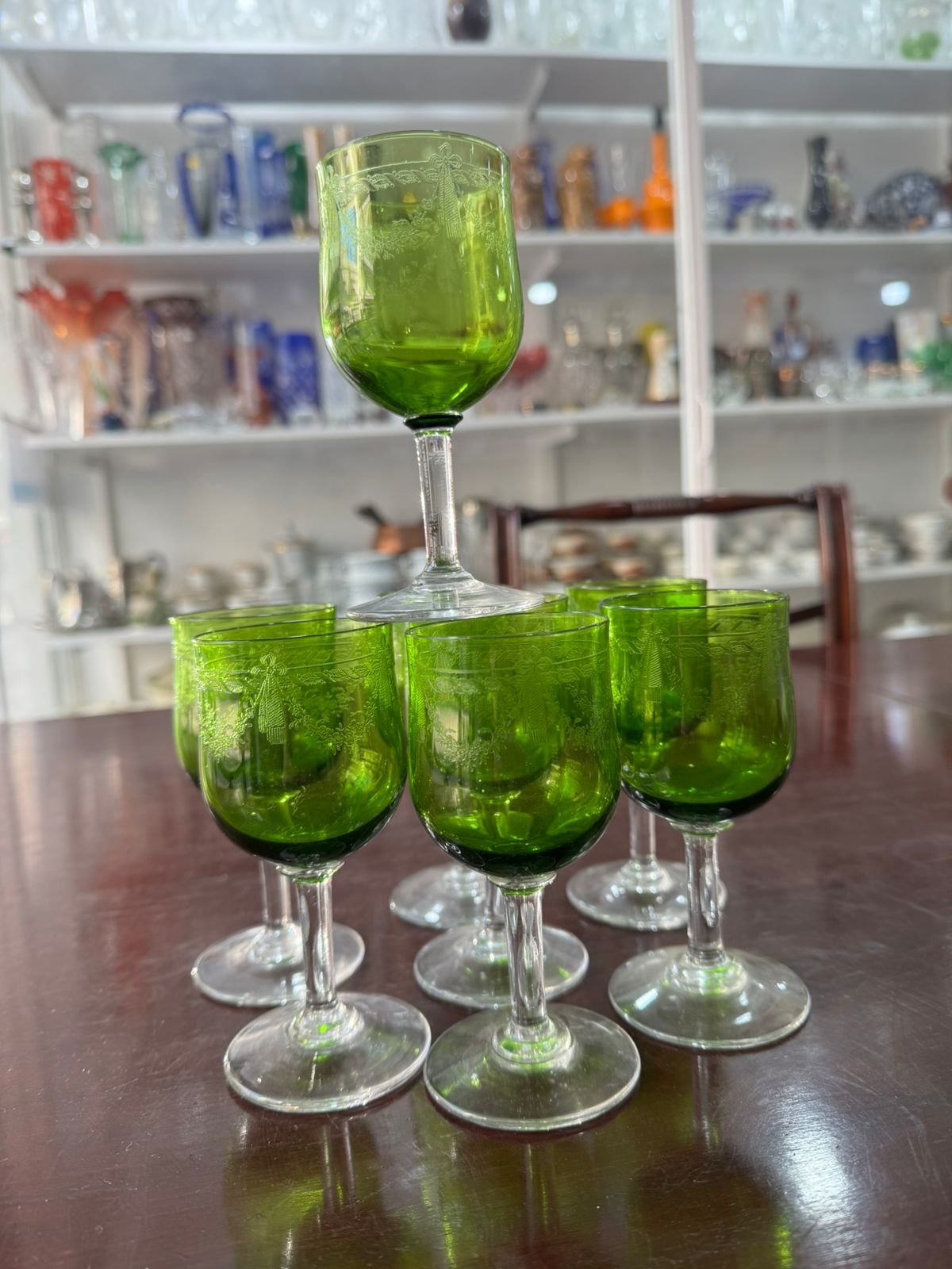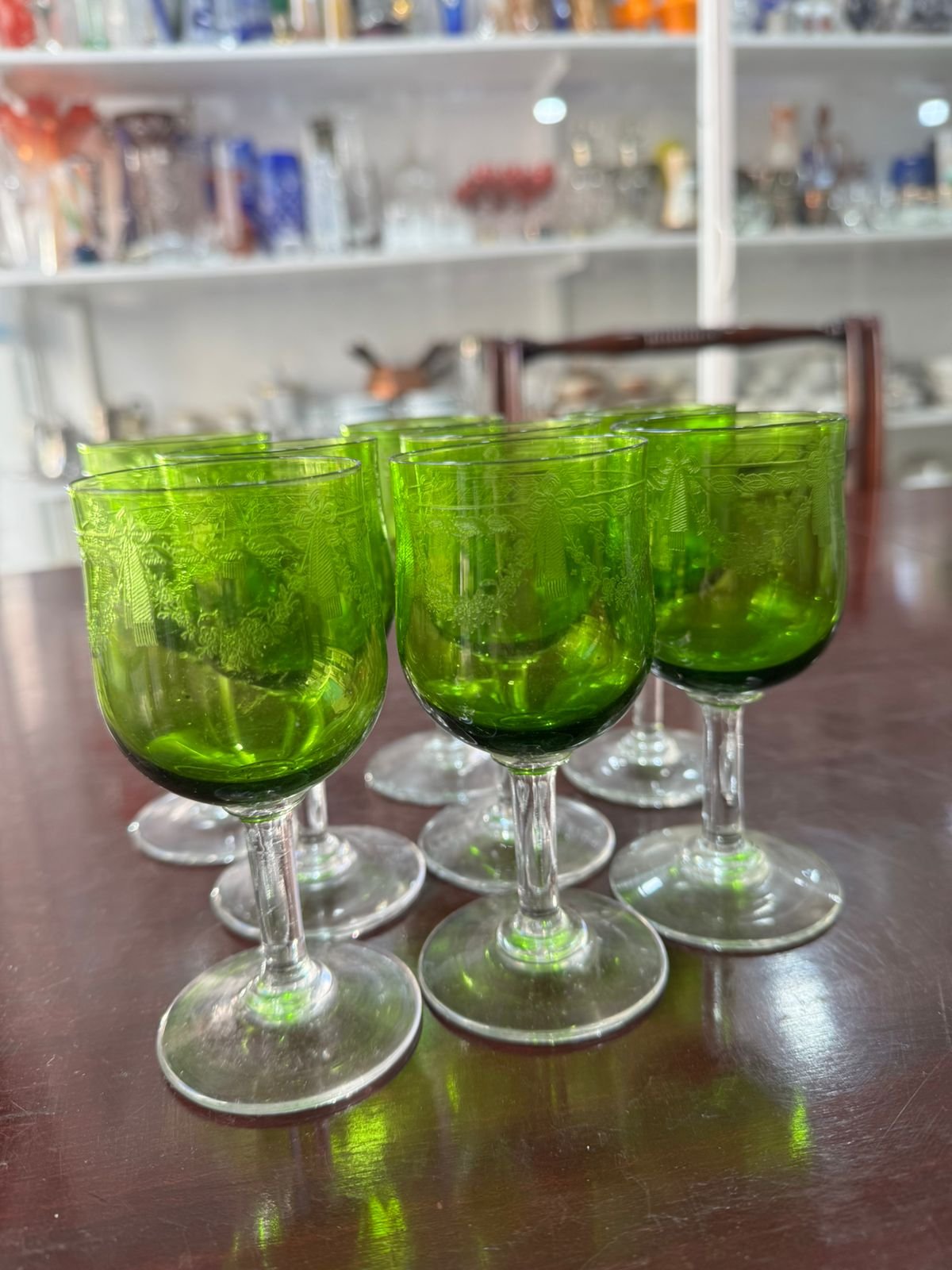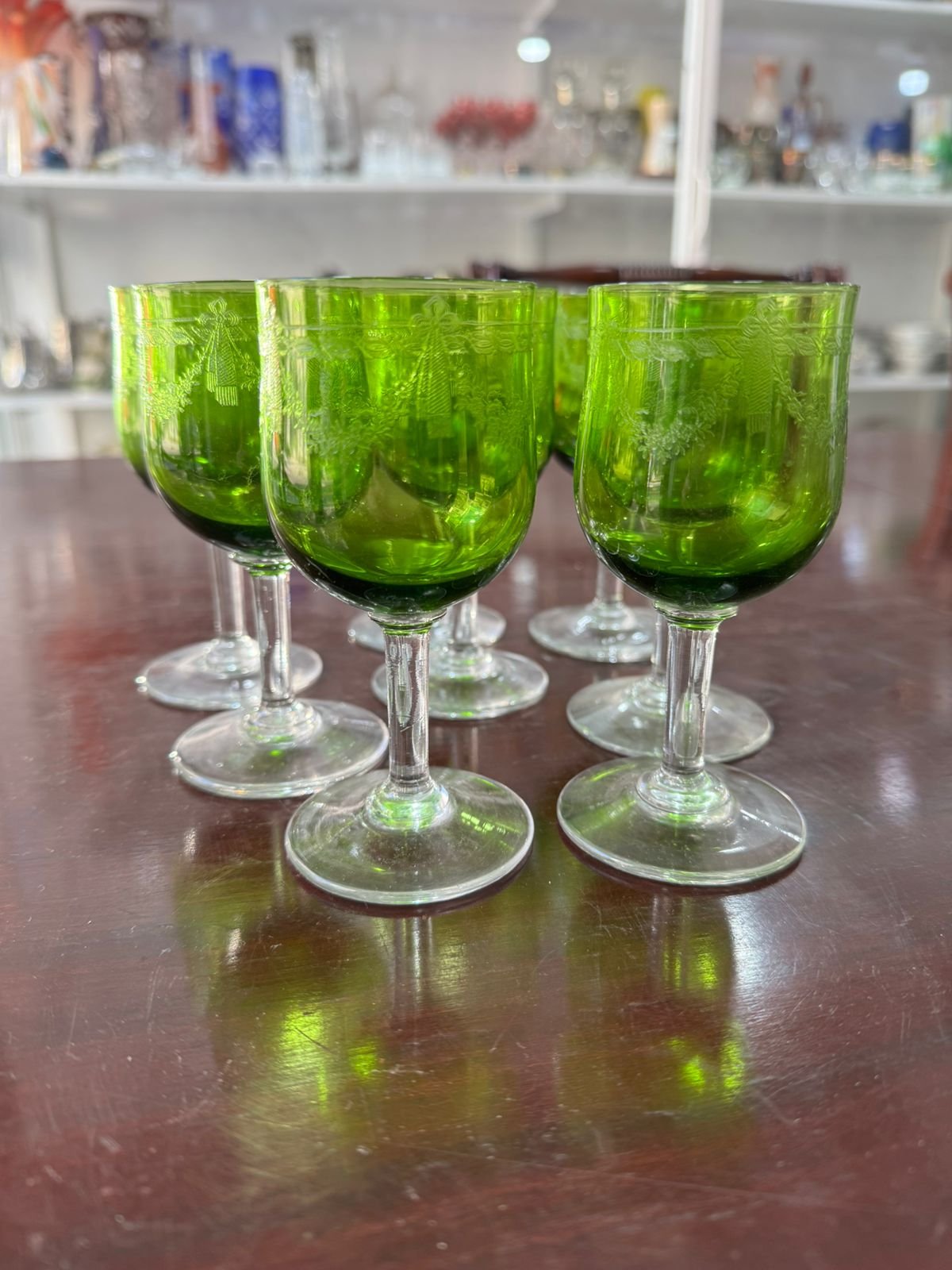 Juego de 8 copas verde cristal grabado al ácido