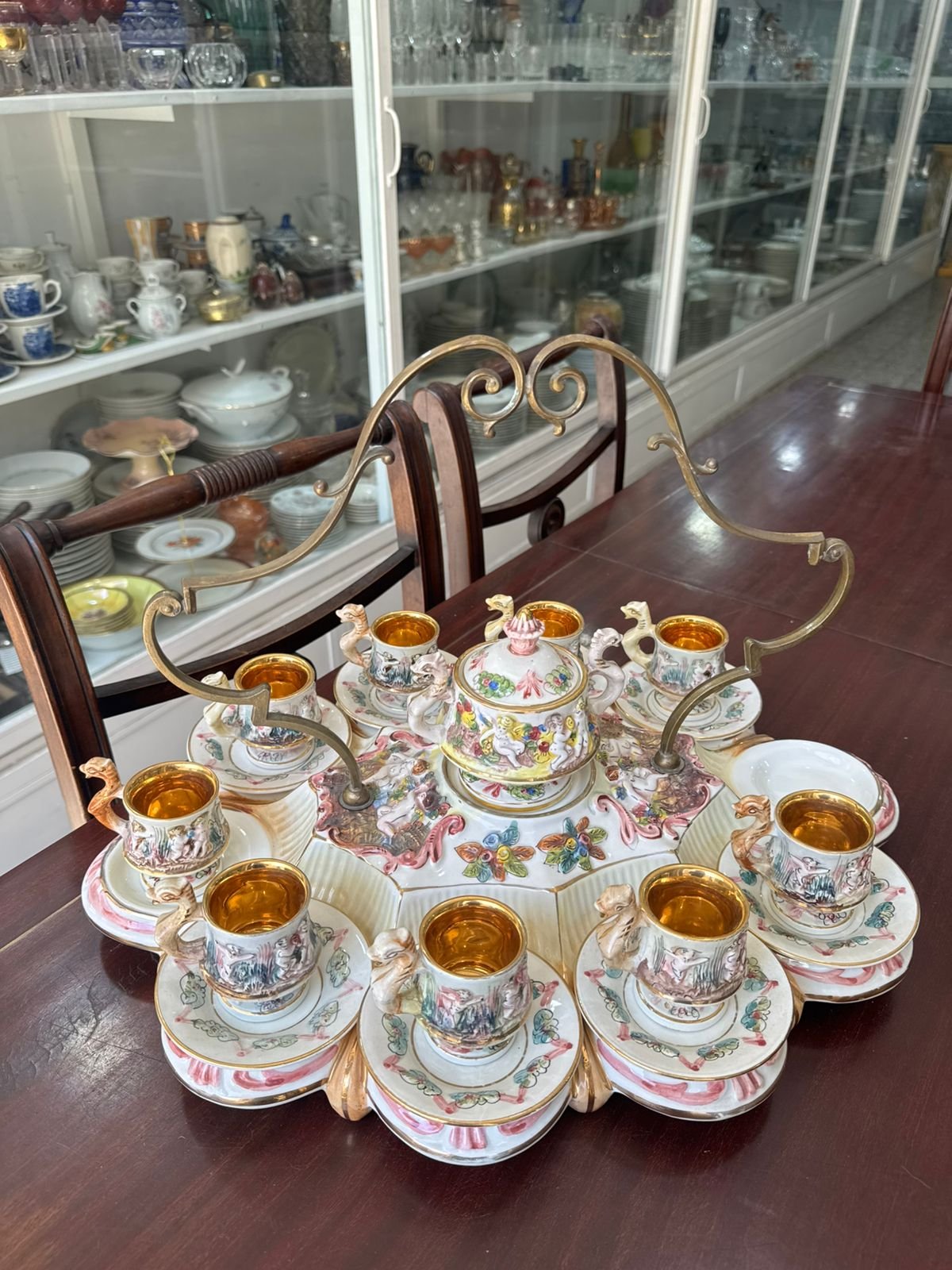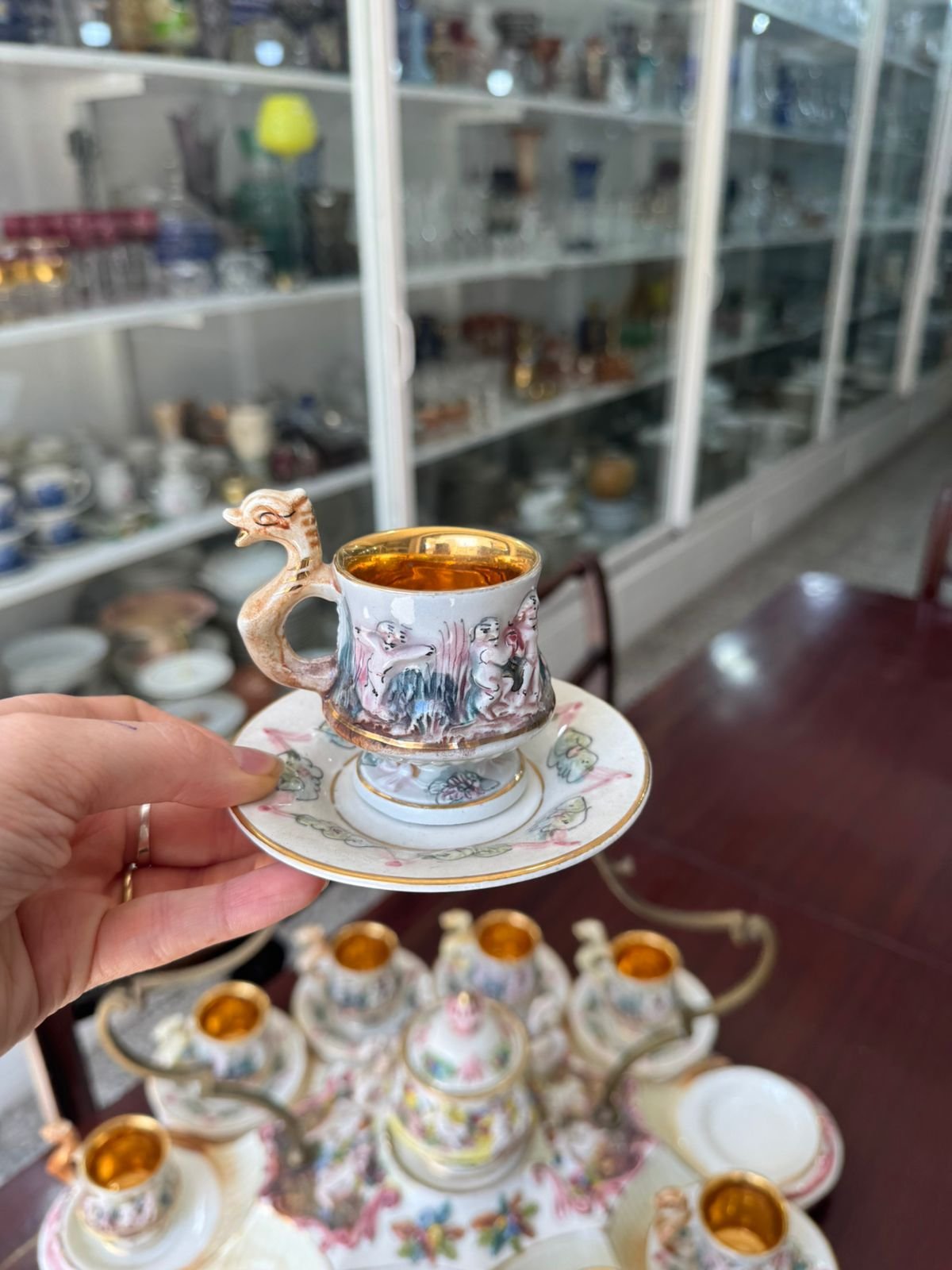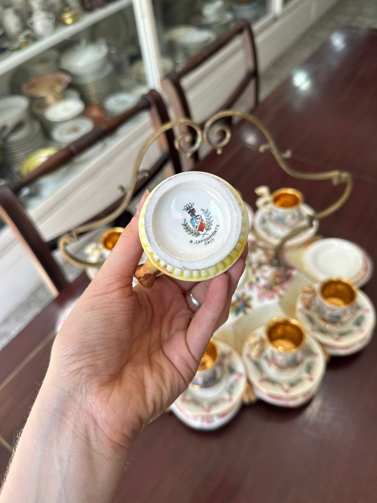 9 tazas con platos: 12 cm de alto x 8 cm de diámetro su boca