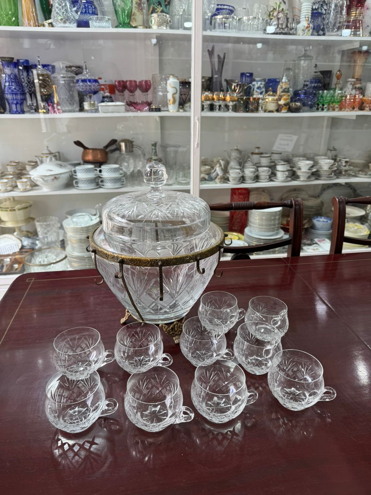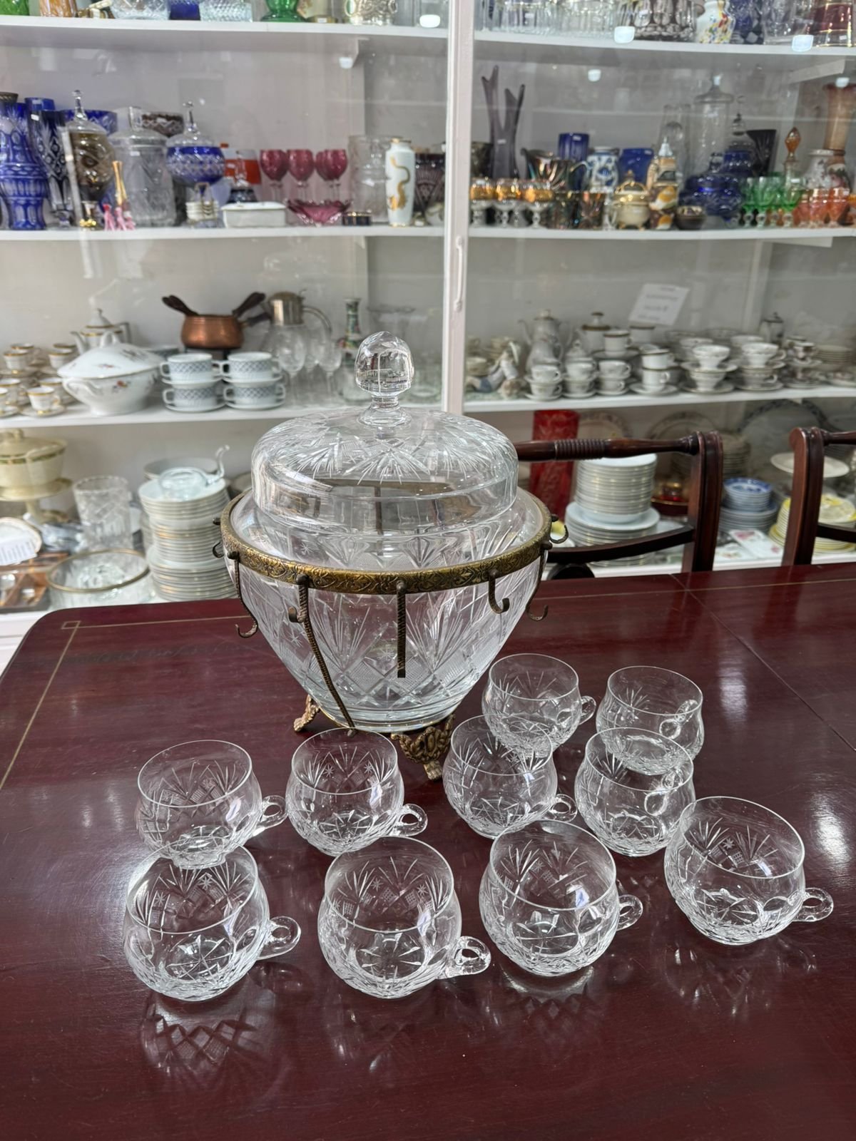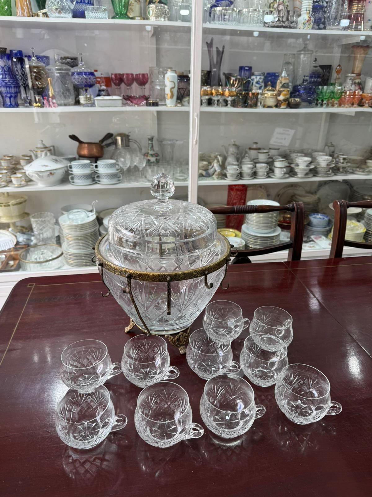 Ponchera de cristal súper tallado con monturas de bronce con 10 tazas