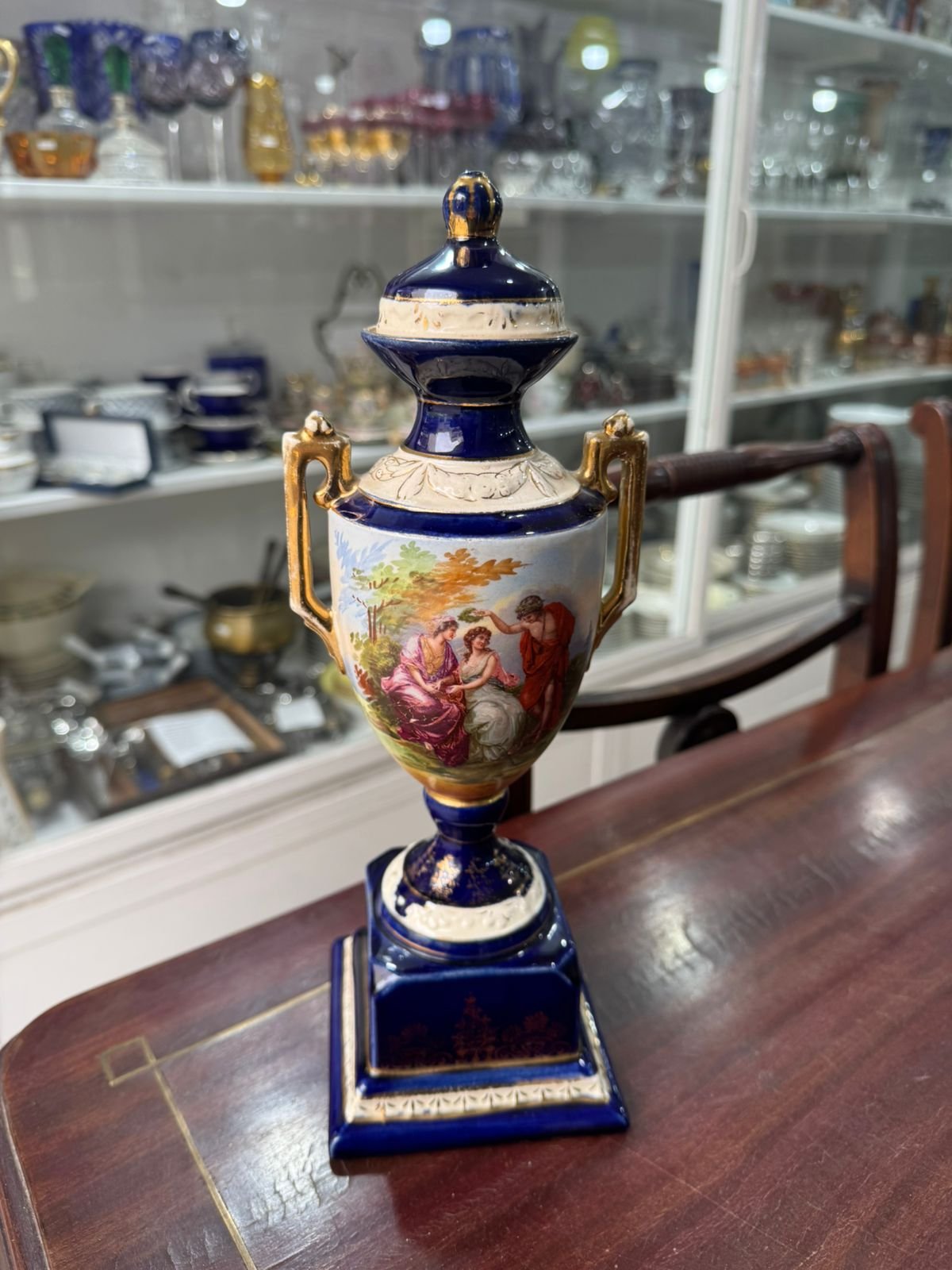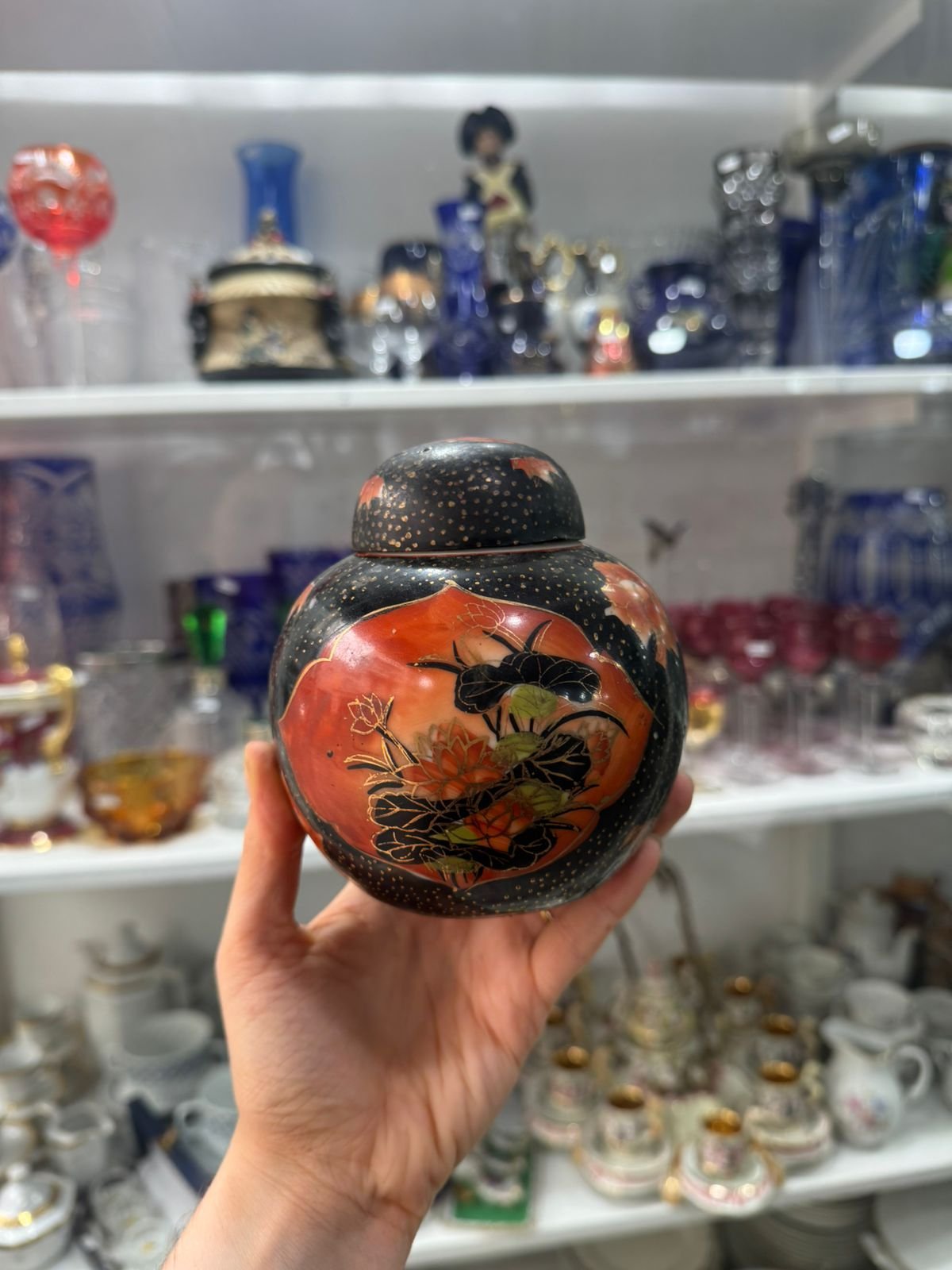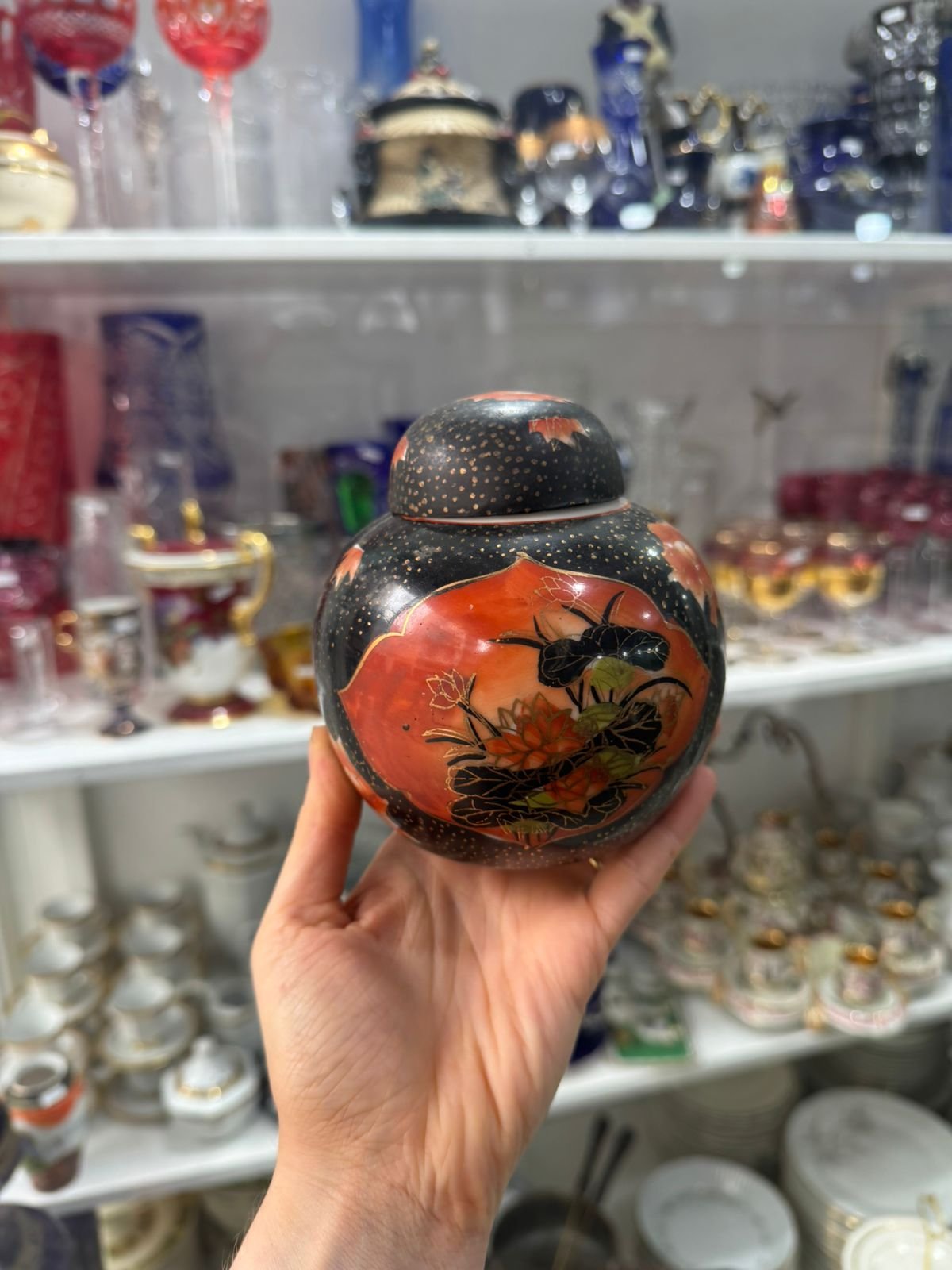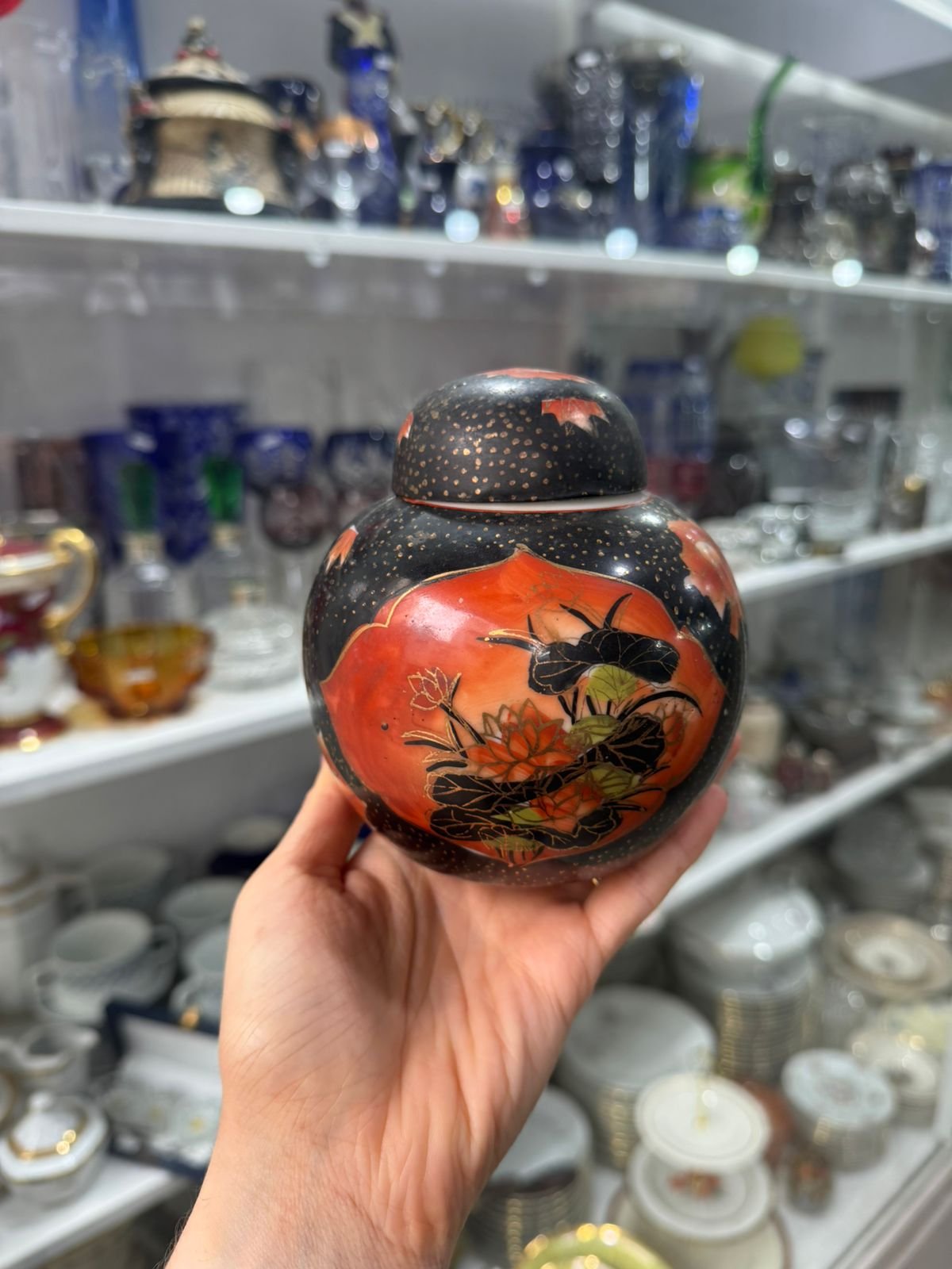 Potiche o contenedor de hebras pintado a mano porcelana oriental