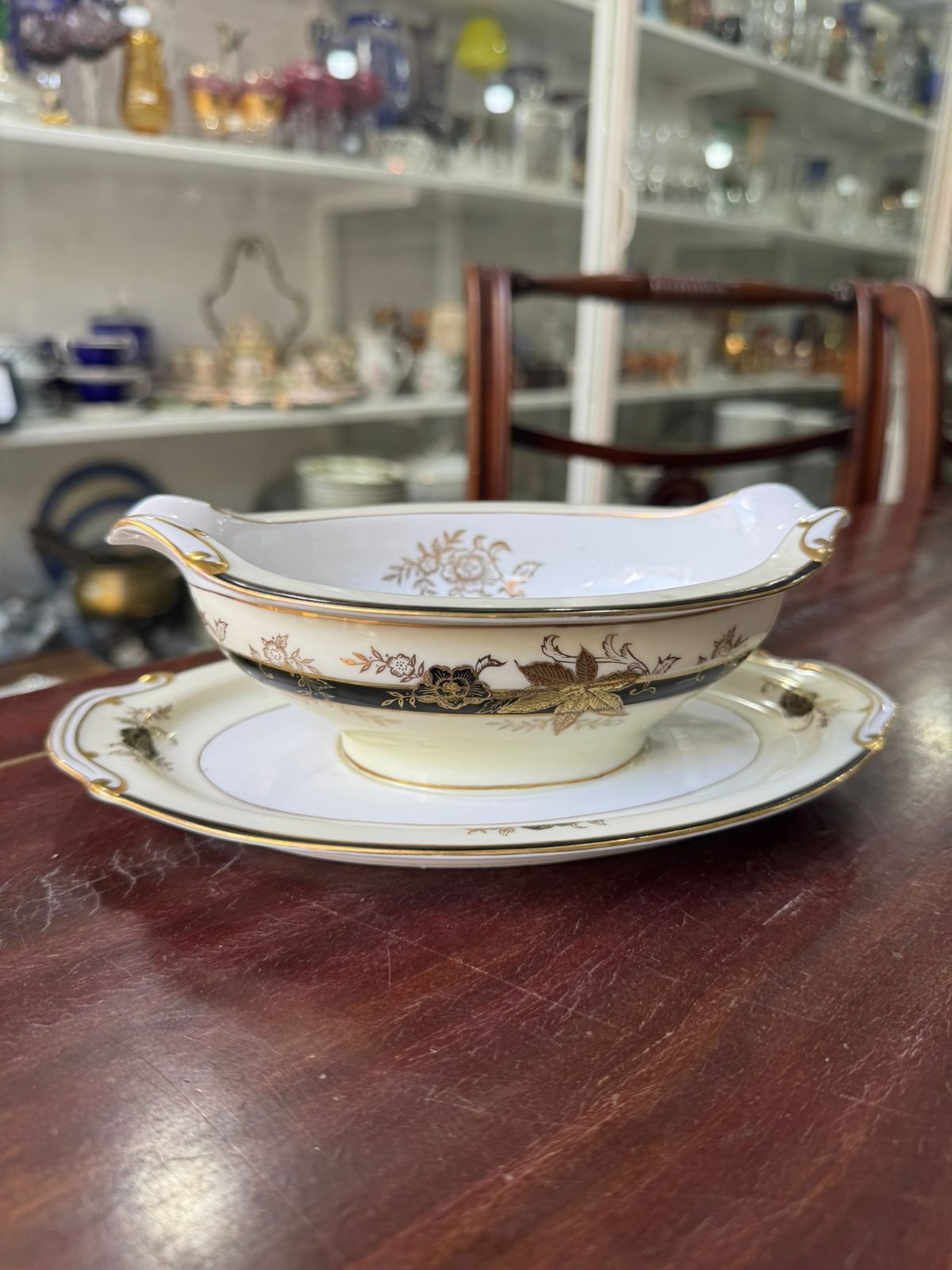 Salsera con fuente de porcelana japonesa pintada a mano con oro