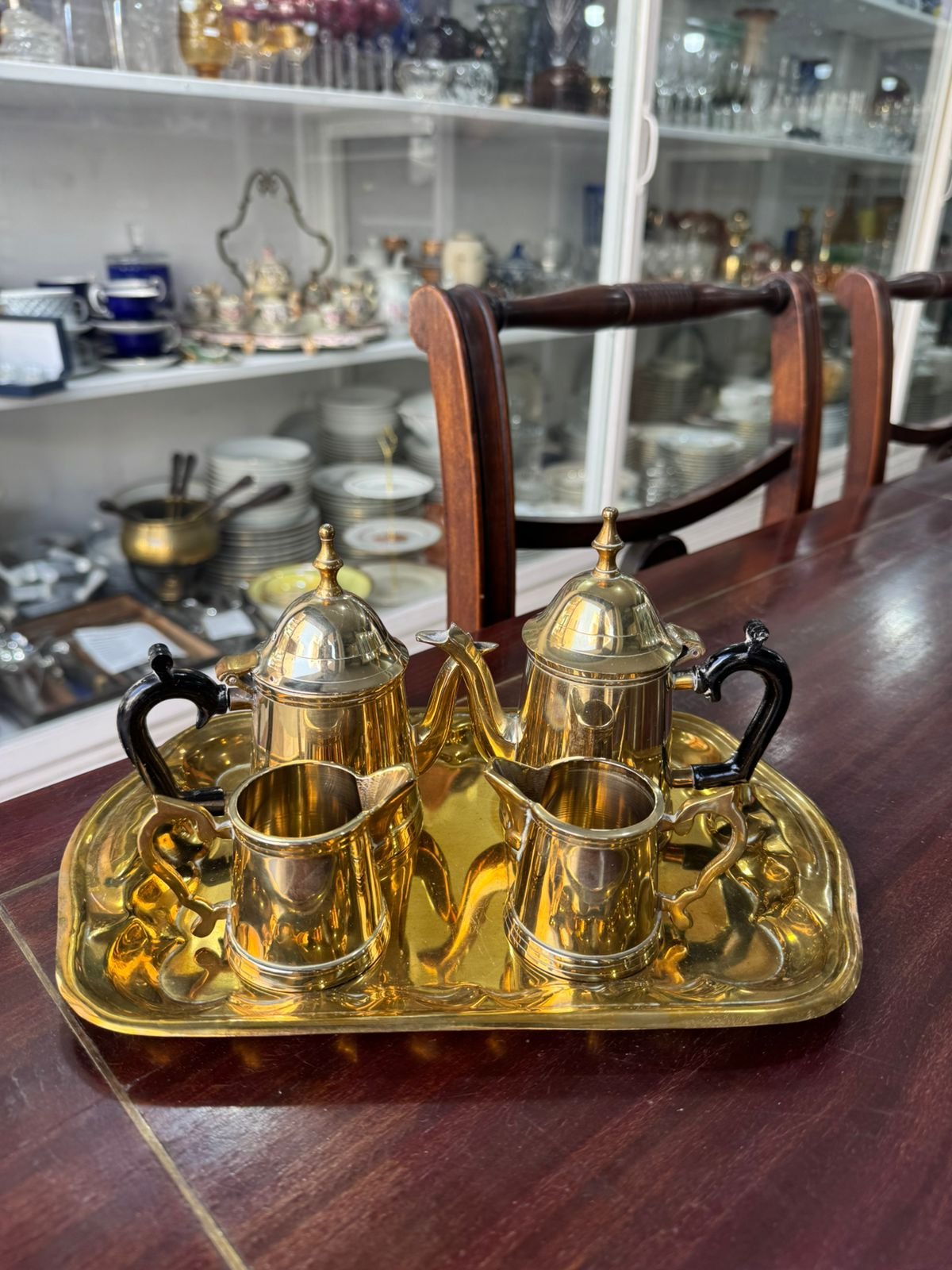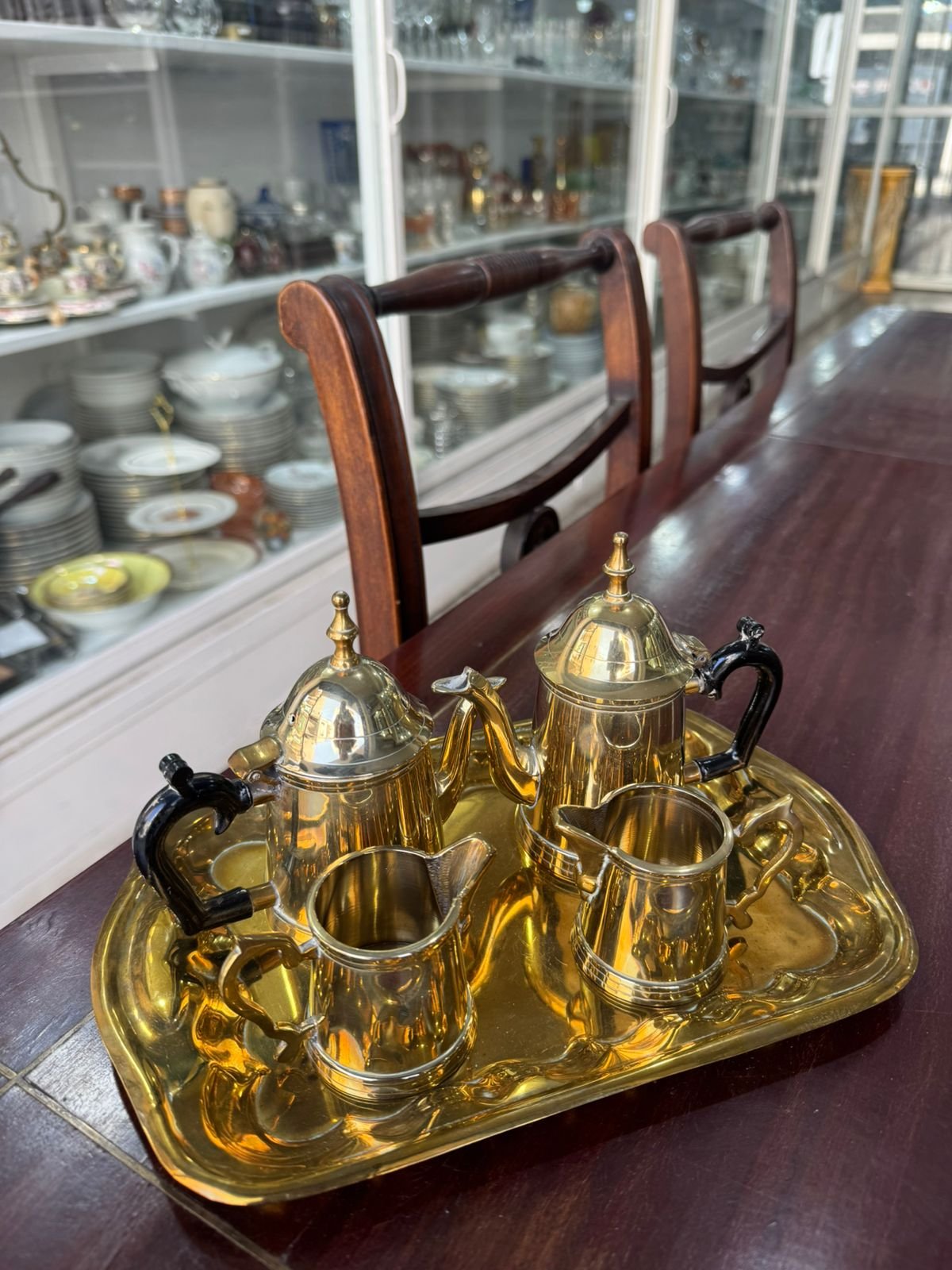 tetera, cafetera, dos lecheras y fuente