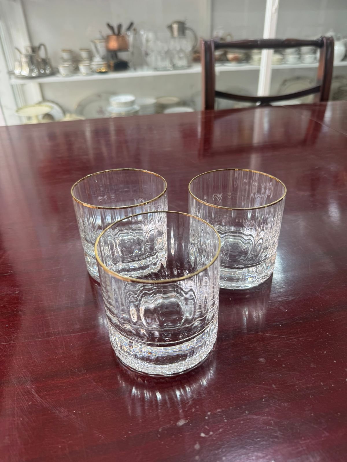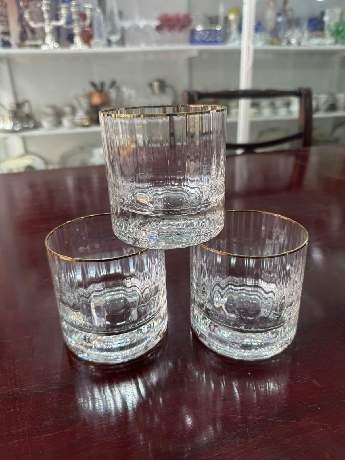 Set de 3 vasos de whisky cristal facetado con guarda en oro